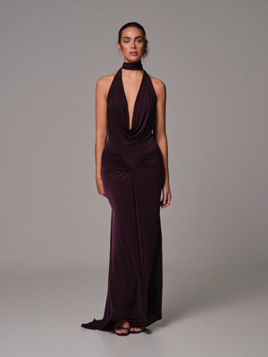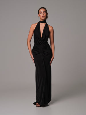 - Design Features: Draped cowl neckline, ruched twist waist, sleeveless, maxi length